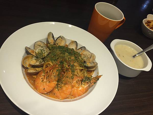 這是紅醬海鮮義大利麵 ($160),套餐再加60元有附脆薯+玉米濃湯